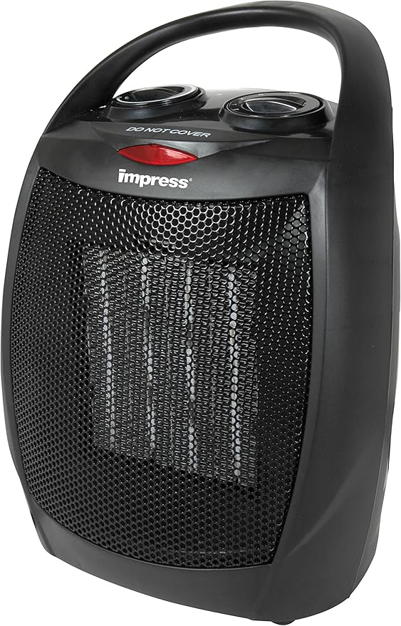 Impress space heater with a ceramic element | fan | 750w and 1500w settings | adjustable thermostat | safety switch | modern look | more :
